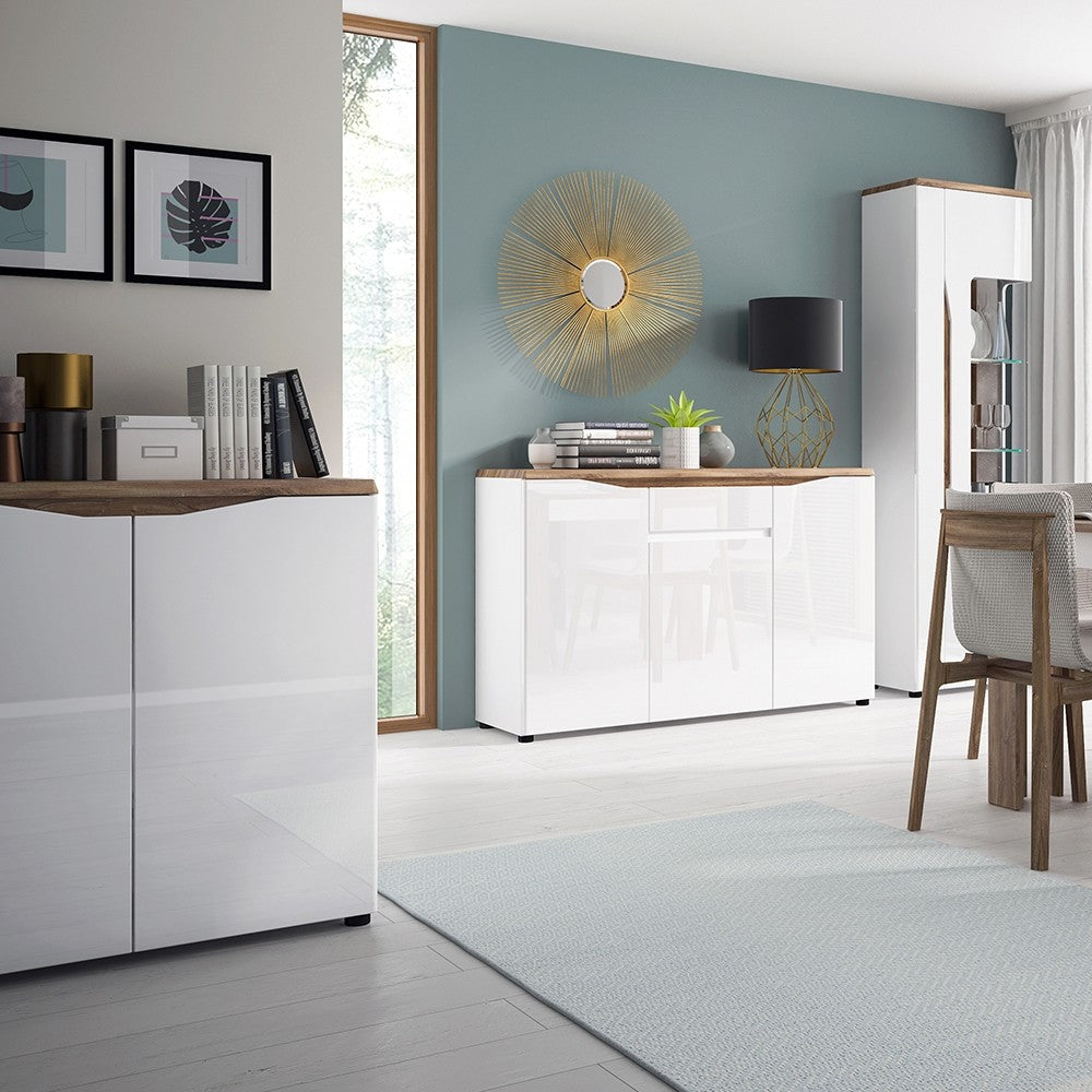 Fordham1 Door Display Cabinet (RH) in Alpine White with high gloss fronts and Stirling Oak.  Great display unit with plenty of room for storage - both displayed and hidden away. The Fordham collection is perfect for lovers of bright and modern interiors. The combination of white with Stirling oak will provide you with a warm interior with a touch of harmony.