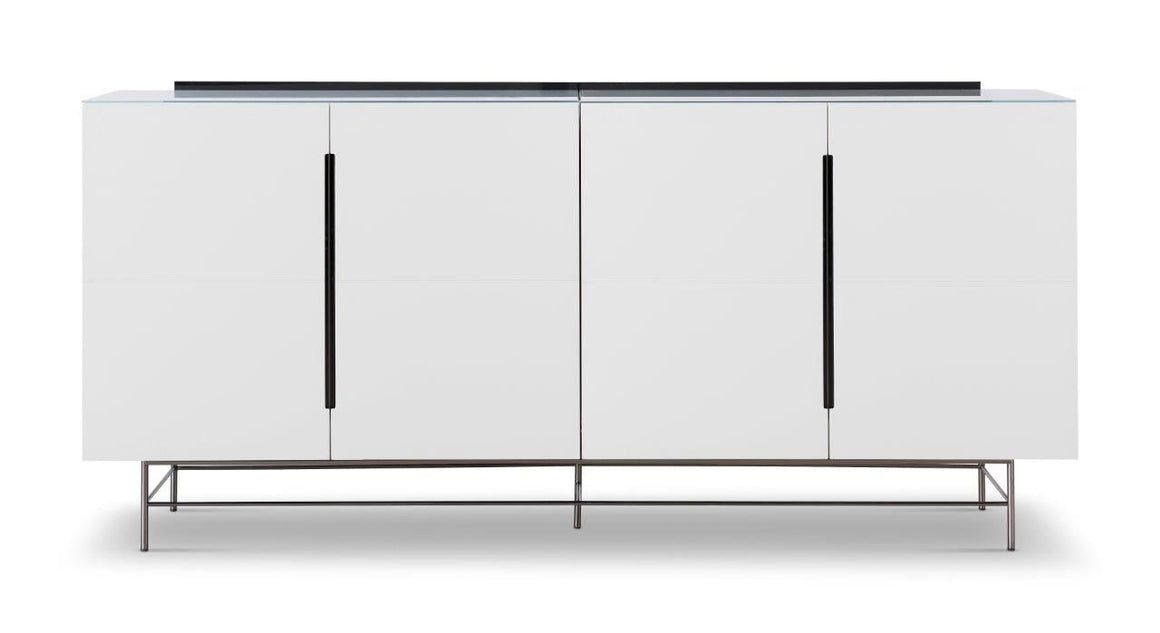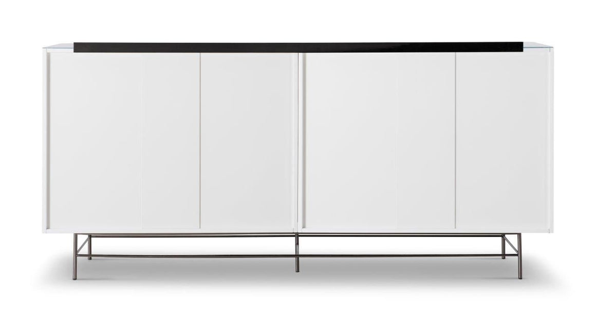 A four door high sideboard in white with dark chrome frame and accents