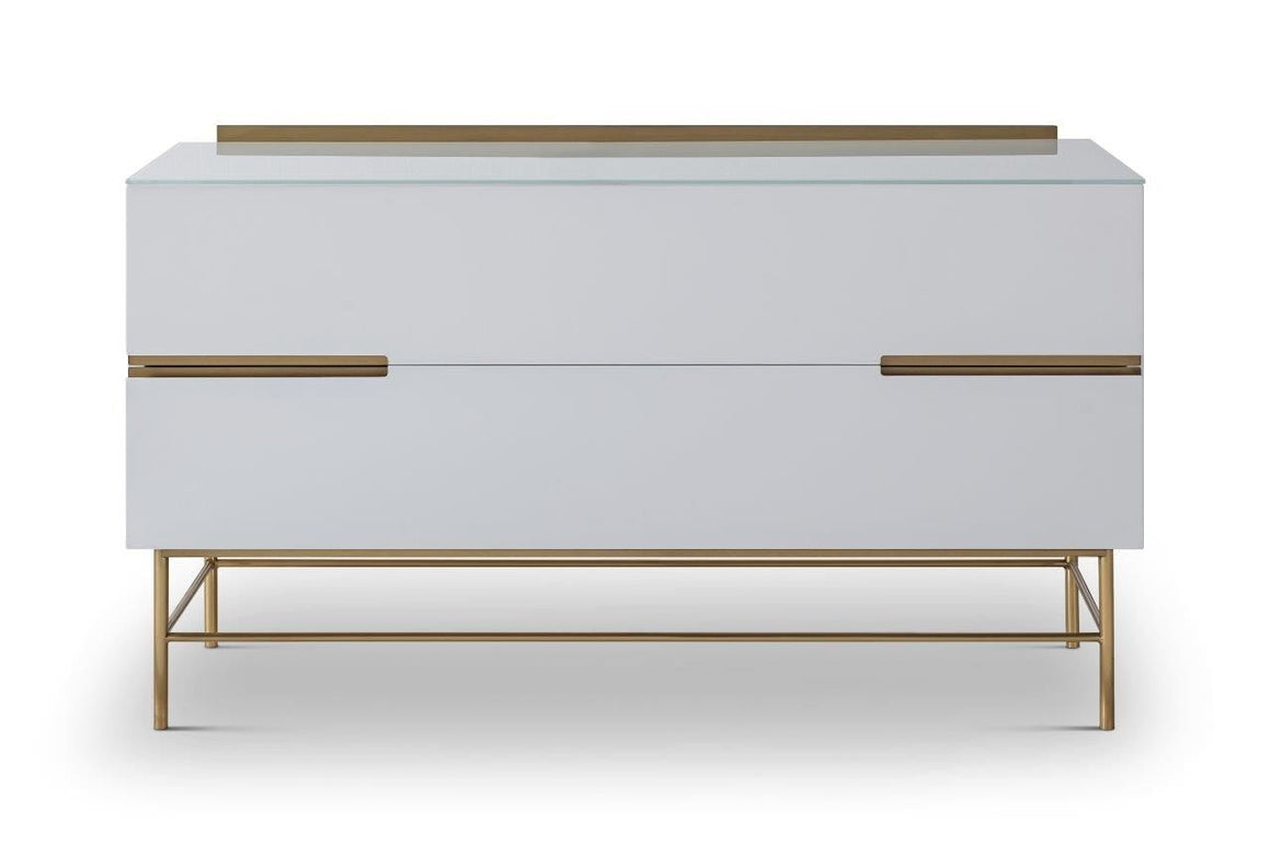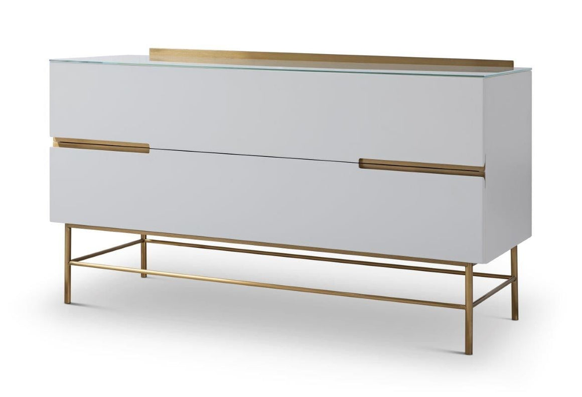 A two drawer low sideboard in white with brass frame and accents